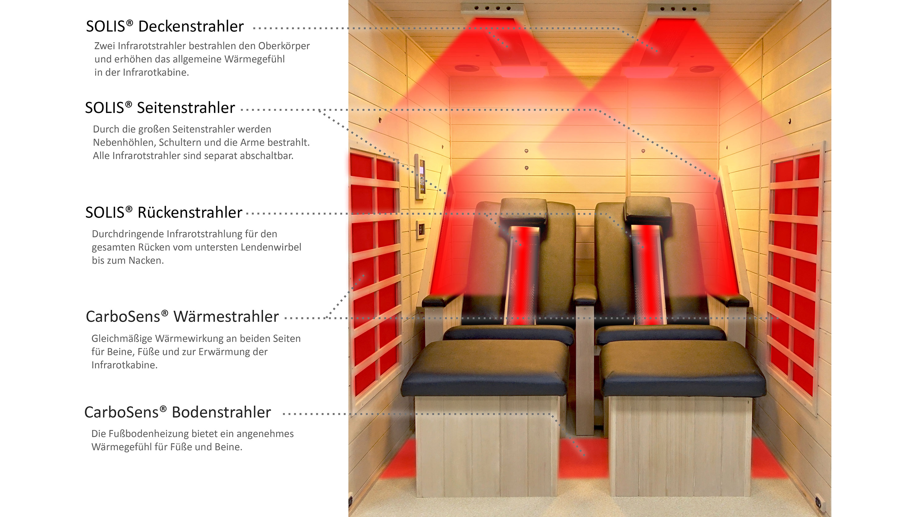 The space inside the cabin has also been increased, so you have enough personal space when using it together and do not come into physical contact with your partner. Simply let go after a stressful workday and relax with all-round infrared radiation from our proven SOLIS® deep heat heaters and Carbosens® panel heaters. The arrangement of these high-quality designed infrared heaters has been perfectly adapted to the needs of the human body and the respective body parts.