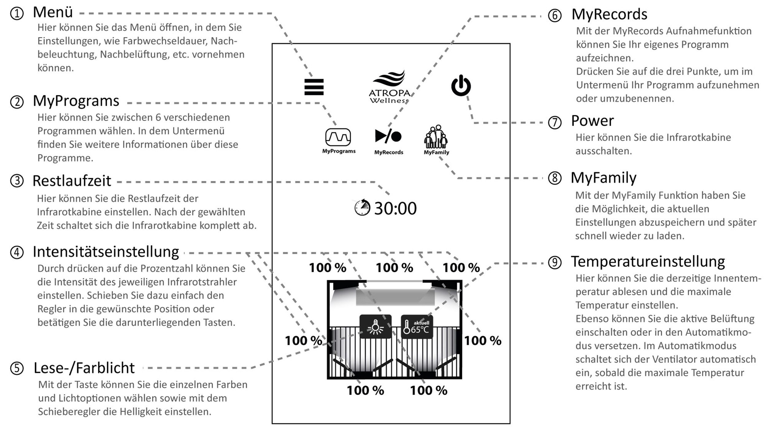 The control of the Infrared Sauna is done via the tablet from the inside. The following settings are possible: